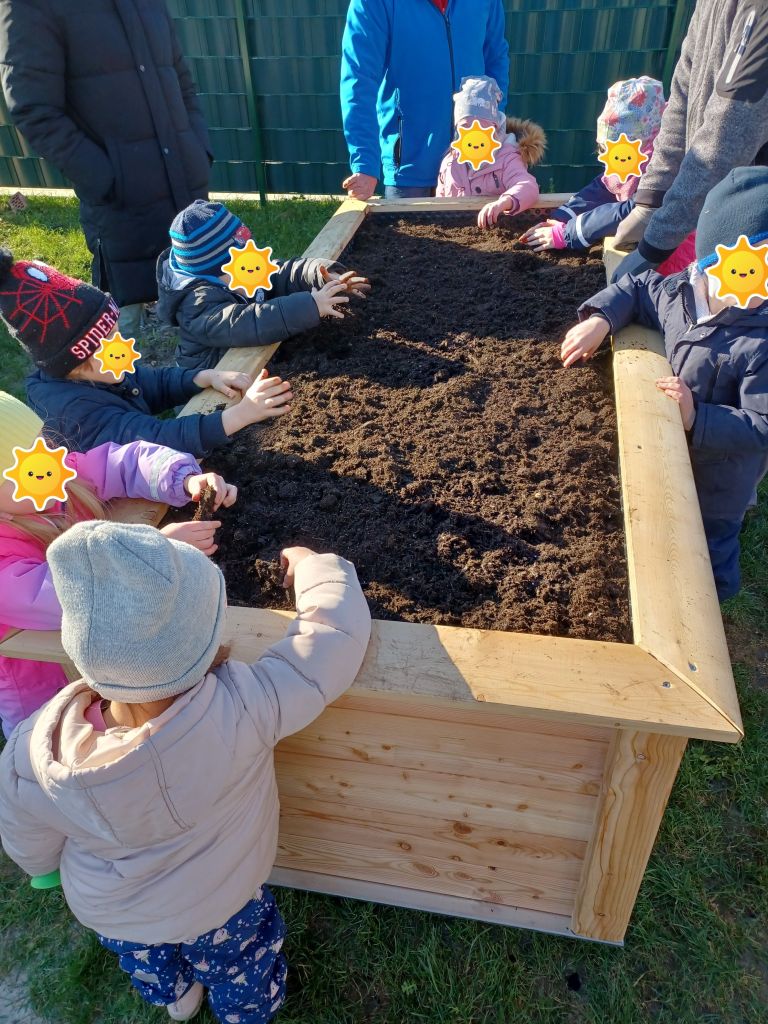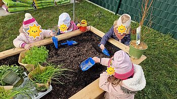 Ein großes Hochbeet gibt den Kindern die Möglichkeit verschiedene Obst- und Gemüsesorten eigenständig anzupflanzen und zu pflegen. Die Kinder können den Kreislauf des Pflanzenwachstums kennenlernen. "Dann können wir unser eigenes Obst und Gemüse ernten. Daraus backen wir einen echten Erdbeerkuchen!" war die Aussage eines Kindes.