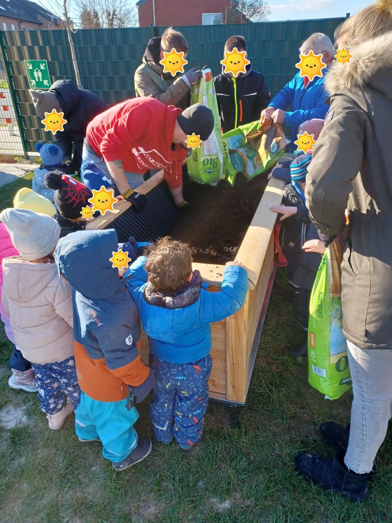 In einer „Eltern – Kind – Aktion“ wurde das Hochbeet gemeinsam aufgebaut. Anschließend haben sie sich einigen Kinder auf den Weg in ein Blumencenter nach Münster gemacht, um gemeinsam Pflanzensamen zu kaufen, die sie in ihr neues Hochbeet eingepflanzt haben.