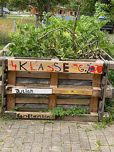 2019 hatten die Viertklässler der OGS in Nordkirchen mit ihrem Projekt begonnen. Die Schüler*innen überlegten sich, was sie machen wollten und kamen auf die Idee ein Hochbeet zu bauen. Mit geschenkten Paletten errichteten sie zuerst einen Rahmen in Form eines Quadrats. Danach wurde das Beet von unten mit Kaninchendraht gegen Eindringlinge wie z. B. Mäuse gesichert. Dann wurde das Beet mit Gartenflies ausgefüttert, als Auslaufschutz.