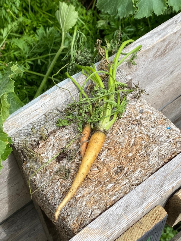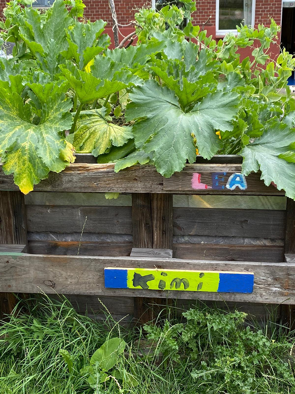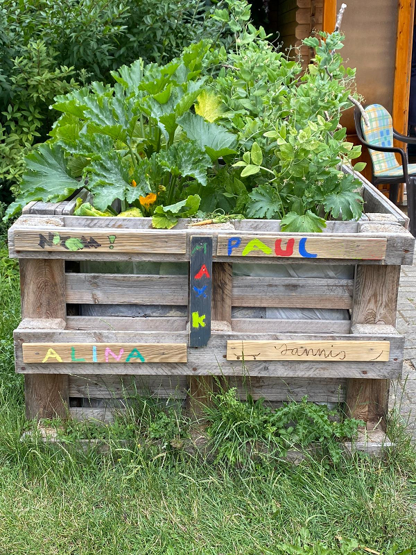 Dann ging alles ganz schnell. Auf den Bildern erkennt man die sehr gute Ernte. Täglich ernten sie nun Möhren, Erbsen und gelbe Zucchini. Am Schluss haben alle OGS Kinder der 4. Klassen, individuell gestaltete Namensschilder an das Hochbeet genagelt. Das war ein sehr erfolgreiches und spaßiges Erinnerungsprojekt.