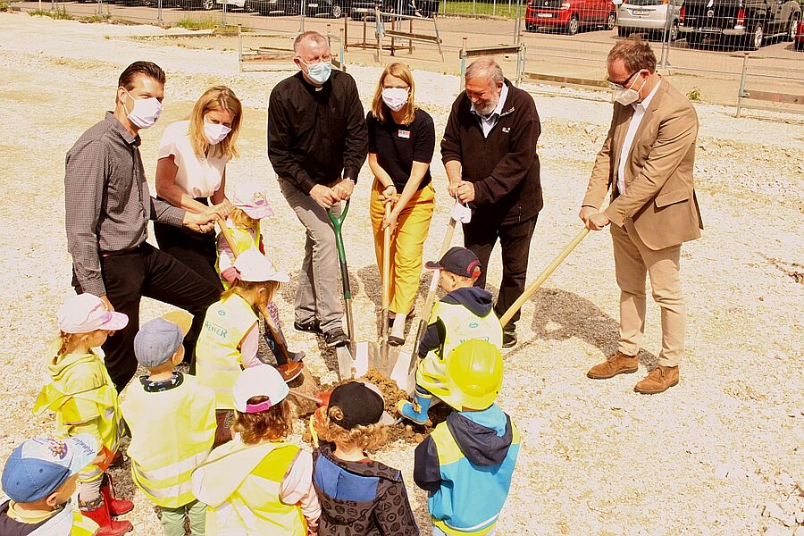 Um 11 Uhr versammelten sich neben den Vertreter*innen der Jugendhilfe Werne (Geschäftsführer, Uwe Schenk; kaufmännische Geschäftsführerin, Katharina Böckenholt; Kita Leitung, Matthias Holsen; Bereichsleitung Kindertagesbetreuung, Stephanie Kißmann; pädagogische Fachberatung, Ute Waterhues) Pfarrdechant Jürgen Schäfer, der Architekt des Projektes (Johannes Evers von Evers-Architekten Partnerschaft), Ludger Risse, Standortleiter und Rüdiger Bolesta, technischer Leiter des St.-Christophorus-Krankenhauses Werne.