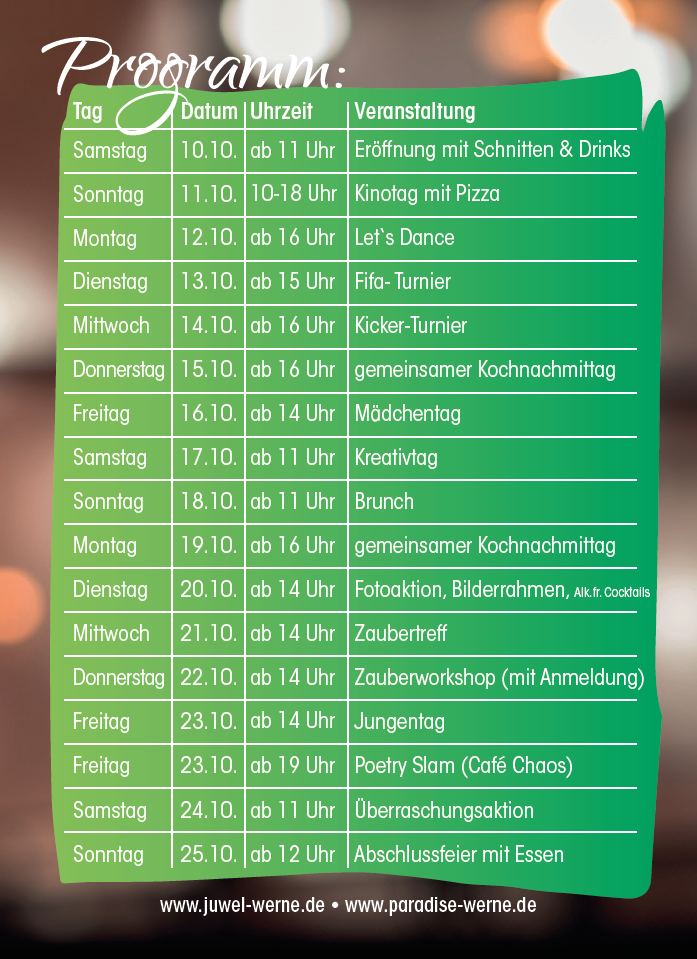 An Fifa- oder Kicker-Turnier teilnehmen, Filme gucken & Pizza essen, kochen mit anderen oder brunchen, Zaubertricks lernen, unterhaltsamen Poetry Slam vom Café Chaos erleben, dich mit anderen Mädchen oder Jungs austauschen– das alles kannst du in der Holiday-Lounge unserer Jugendzentren JuWeL & Paradise!!