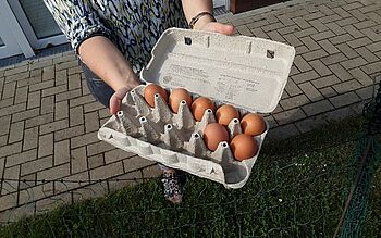 Zwei Wochen lang haben sich die Kinder auf dem Außengelände der Kita „Grashüpfer“ aus Ascheberg um vier handzahme Legehennen von „Huhn on Tour“ liebevoll gekümmert. Beim Einzug hatten die Hühner von „Huhn on Tour“ all das mitgebracht, was für sie wichtig ist: einen mobilen Hühnerstall, aber auch das Futter, Einstreu, eine Wassertränke, das Sandbad und den Zaun. Die Kinder haben sich täglich um die Hühner gekümmert, sie gefüttert, den Stall gesäubert und die frisch gelegten Eier eingesammelt. „Denn diese vier Hennen haben sich bei uns so wohl gefühlt, dass sie mehrere Eier am Tag gelegt haben. Die haben wir in fast allen Variationen probiert. Mensch, war das Rührei lecker!“, berichtet uns die Kita „Grashüpfer“.