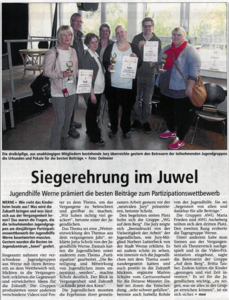 60 Kinder, Jugendliche und Erwachsenen haben ab 10.00 Uhr die Möglichkeit genutzt, die Präsentationen der Wettbewerbsbeiträge in den Räumlichkeiten des Juwels anzuschauen. Nach einem verzögerten Beginn der Veranstaltung (es gab wie im letzten Jahr wieder technische Probleme mit der Datenübertragung und eine Teilnehmergruppe ist uns leider abhanden gekommen), war der Vormittag ein voller Erfolg mit gespannt aufgeregten WettbewerbsteilnehmerInnen, interessierten BesucherInnen, einer wohlwollenden, kompetenten Jury und fleißigen HelferInnen im Hintergrund (hier gilt ein besonderes Dankeschön Marion, Ulla , Hartmut, Peter, den Bufdis, dem Juwelteam und Markus!!!). Ohne das große Engagement, die tollen Ideen und viel Arbeit und Durchhaltevermögen der teilnehmenden Gruppen wäre dieser gelungene und beeindruckende Tag nicht möglich gewesen. Vielen Dank an alle, die dazu beigetragen haben!