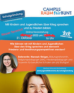 Am 26. Oktober, geht die Veranstaltungsreihe zu dem Thema „Mit Kindern und Jugendlichen über Krieg sprechen und zu Frieden bilden“ weiter. Als Referentin ist Hannah Geiger eingeladen, sie ist Bildungsreferentin, Religionspädagogin (MA), Friedenspädagogin und Dozentin für berufliche Schulen am ptz Stuttgart.