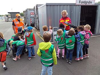Bei der Führung durch den Hof lernten sie, welche Abfälle man anliefern kann, wie die Abfälle sortiert werden und was Neues daraus entstehen kann. Anschaulich erklärt wurden ihnen die Unterschiede zwischen „Wertstoff“ und „Restmüll“. Die Kinder begegneten dem „Rudi Restmülltonne“, der schlimmes Bauchweh hatte, da er falsch befüllt wurde. An den verschiedenen Sammelbehältern konnten die Kinder ihn nach und nach von den verwertbaren Abfällen befreien und diese richtig entsorgen. Durch eigenes Tun, erfuhren sie welche Arten von Abfällen auf einem Wertstoffhof entsorgt werden können und beschäftigten sich mit den Themen Wertstofftrennung, Abfallentsorgung, Recycling und auch Abfallvermeidung. Bei der Vorführung eines Müllfahrzeuges konnten die Kinder einen Blick in das Innere des Fahrzeugs und anschließend sogar in die Fahrerkabine werfen.