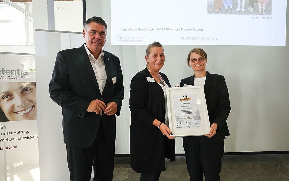 Am 6. November, in der Ökologiestation in Bergkamen, hat das Bündnis für Familie Kreis Unna zum achten Mal den Preis „Pluspunkt Familie“ an Unternehmen verliehen. Diesmal unter dem Aspekt „Wiedereinstieg in den Beruf“. 20 Unternehmen erhielten eine Urkunde als Dank für ihre Teilnahme und wir waren auch dabei. Mit „Lebensphasenorientiertes Arbeiten als wichtiges Thema“ haben wir mitgemacht.