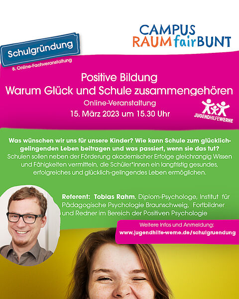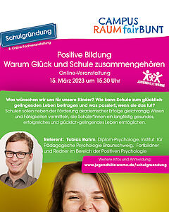In seinem Vortrag gibt Diplom-Psychologe Tobias Rahm anhand internationaler und nationaler Beispiele Einblicke in das Konzept der Positiven Bildung (Positive Education). Das übergeordnete Ziel der Bewegung: Schulen sollen neben der Förderung akademischer Erfolge gleichrangig Wissen und Fähigkeiten vermitteln, die Schüler*innen ein langfristig gesundes, erfolgreiches und glücklich-gelingendes Leben ermöglichen. Forschungsergebnisse haben vielfach bestätigt, dass sich „Glück“ lernen und lehren lässt und dass Menschen mit hohem Wohlbefinden viele Vorteile im Leben genießen. Nimmt man zu diesen Erkenntnissen noch die weite Verbreitung von psychischen Störungen in der Bevölkerung hinzu, sollte die systematische Vermittlung von psychischen und sozialen Kompetenzen in unseren Bildungseinrichtungen umso näherliegen. Das Ziel der Chancengleichheit durch Bildung gilt auch für Wohlbefinden. Der Vortrag wird Impulse geben und von Beispielen erzählen, wie sich Schulen durch mehr Glückskompetenz verändern und aufblühen.
