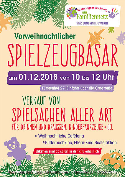Unsere Kindertageseinrichtung "Am Familiennetz" lädt ein: Spielzeugbasar am 01. Dezember von 10 bis 12 Uhr. Dazu gibt es weihnachtliche Caféteria, Bilderbuchkino und Eltern-Kind Bastelaktion. Wir freuen uns auf Euch!