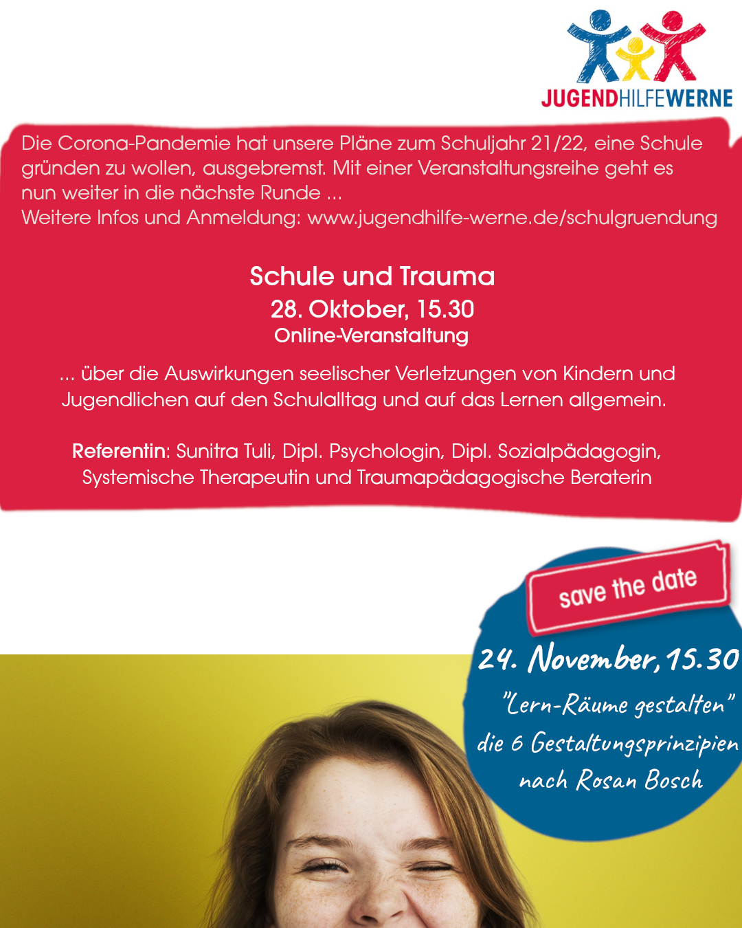 Unsere 2. Online-Verantslatung, am 28. Oktober um 15.30 Uhr. Ein Zoom-Vortrag mit dem Thema “Schule und Trauma”.